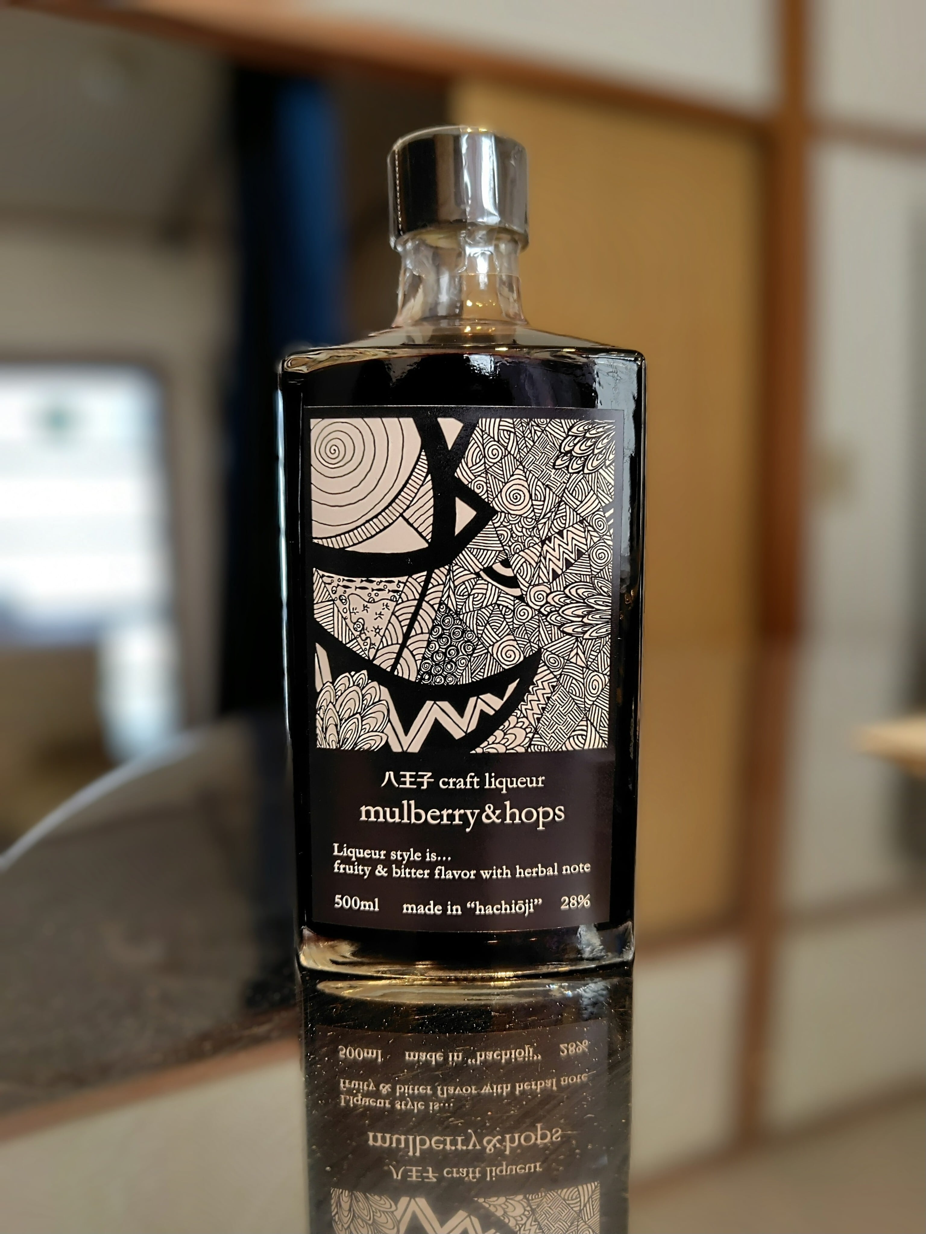 八王子craft liqueur 〚mulberry&hops〛は八王子に所縁のある mulberry=桑の実と、八王子産ひよどり山ホップによる、甘くてほんのり苦いタイプのリキュールです。